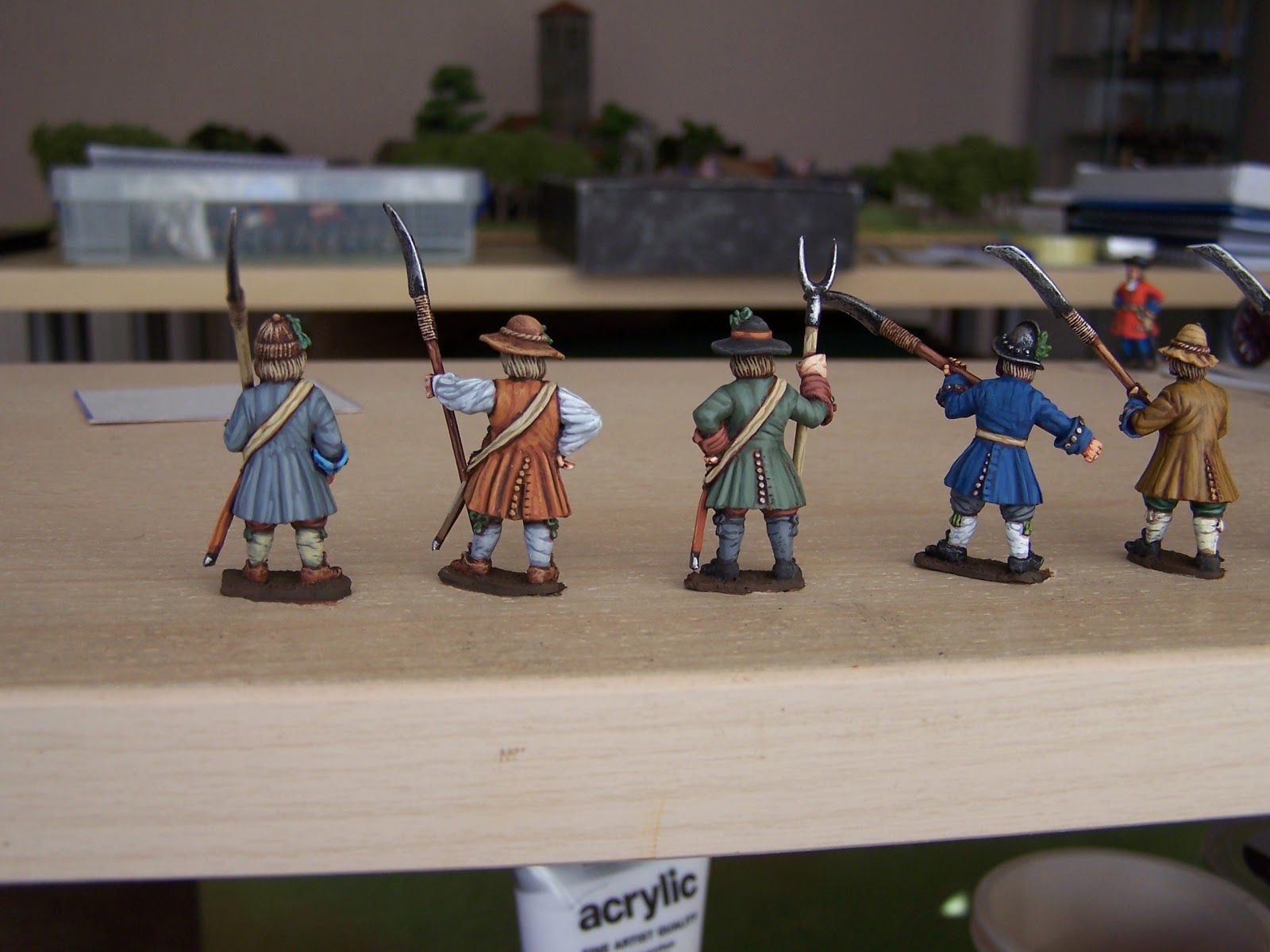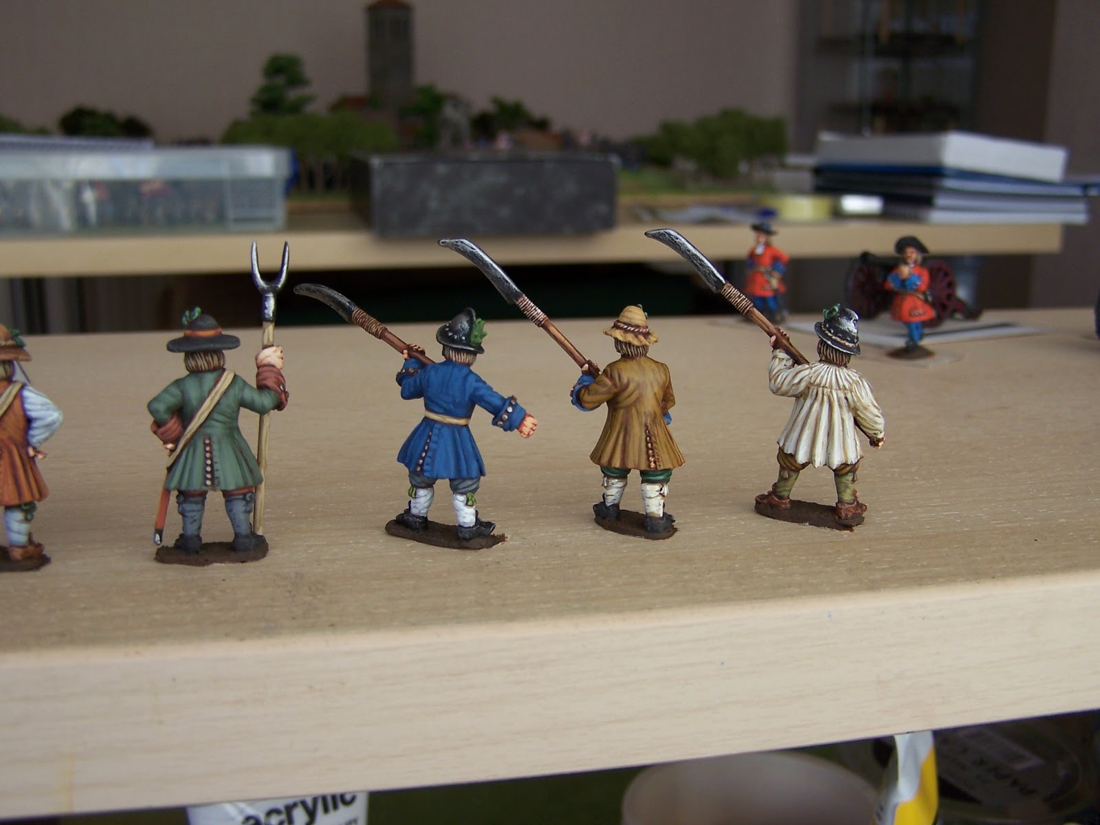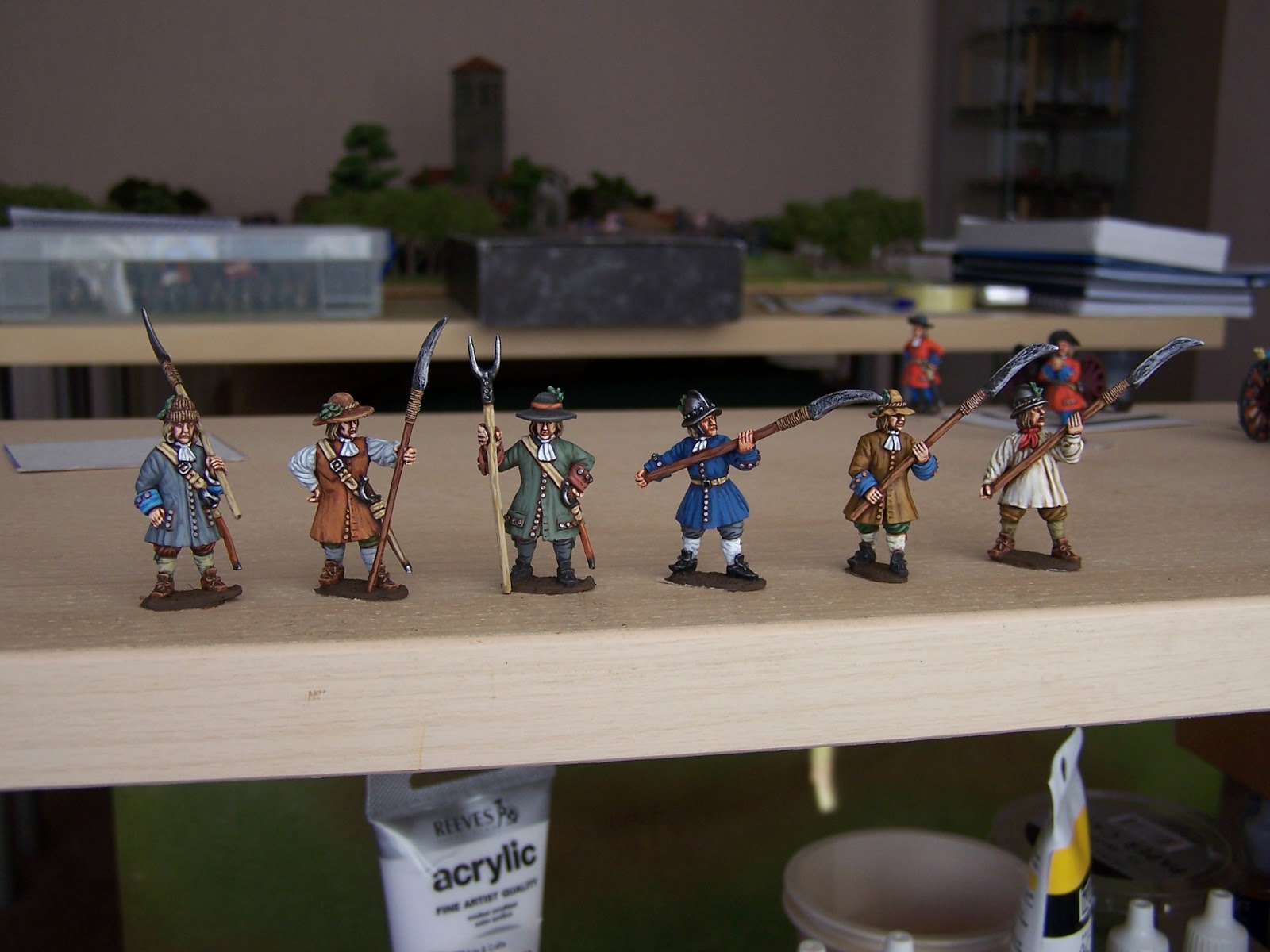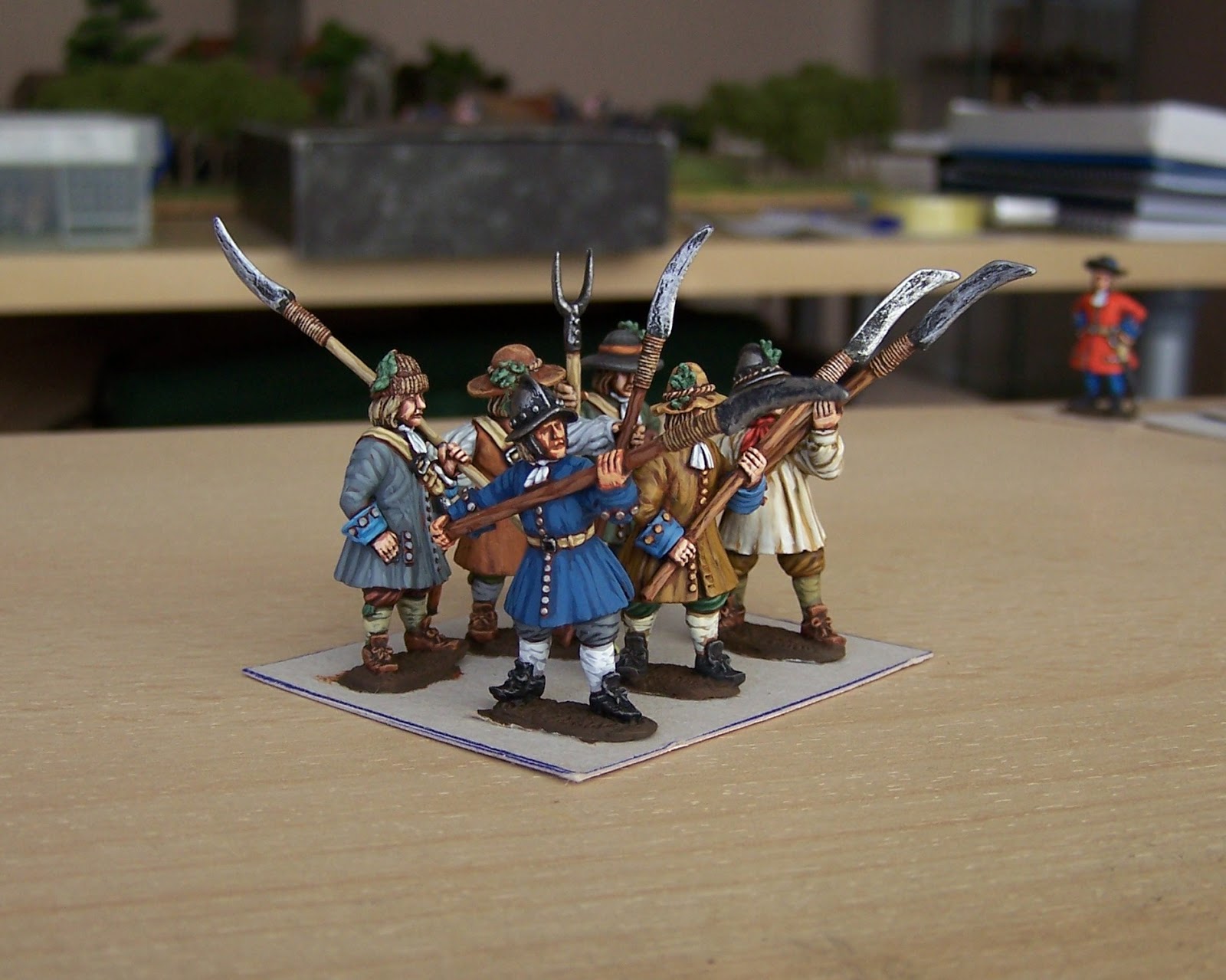 Some pics of the Sedgemmor 'sythemen' component of the first rebel unit. I've started the musketeers for this unit but nothing to show yet. As I paint more of these I may do a bit of swopping around to give a better look to the final unit but you get the idea. Some more pikemen will be added and a few figs in more 'military' clothing/ colours.